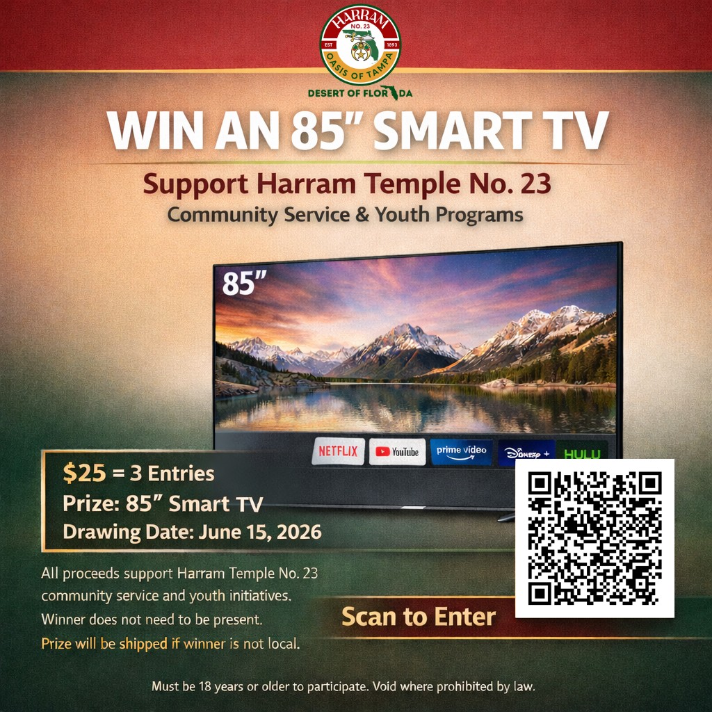 Harram Temple No. 23 is excited to announce our 85” Smart TV Giveaway in support of our Community Service and Youth Programs.
